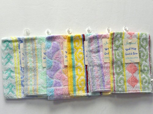 This is a very popular type of wash mitt used widely in Europe. It is made of a fine quality cotton and specially engineered to make bathing babies and young children easier. Simply slide your hand in and wash away. 10 Friendly, colorful patterns measuring approximately 21cm by 15cm in a set. (Also great size for holding small cold packs or ice cubes to curb the cold)